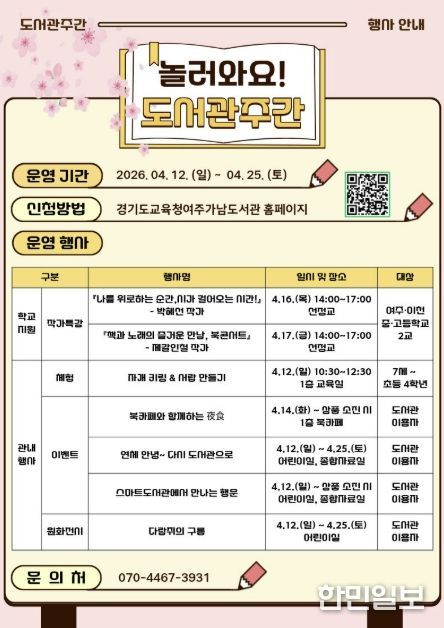 한민일보 서울포커스 전희주 기자 | 경기도여주교육지원청 직속기관인 경기도교육청여주가남도서관은 4월 도서관주간을 맞아 지역주민과 학생들을 위한 다양한 독서문화 프로그램을 운영한다.