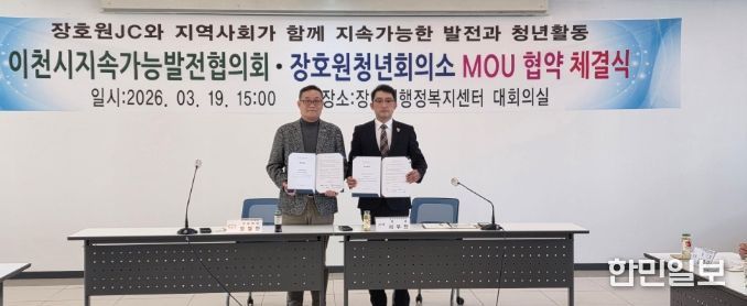 한민일보 서울포커스 박용남 기자 | 이천시지속가능발전협의회는 지난 3월 19일, 장호원읍행정복지센터 대회의실에서 장호원청년회의소와 지역사회 청년활동의 리더십 과제 협업을 위한 업무협약(MOU)을 체결했다고 밝혔다.
