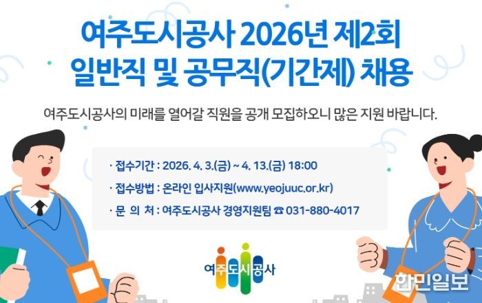 한민일보 서울포커스 전희주 기자 | 여주도시공사는 공공서비스 품질 향상과 조직 경쟁력 강화를 위해 2026년 제2회 일반직 및 공무직, 기간제 채용을 실시한다고 밝혔다.