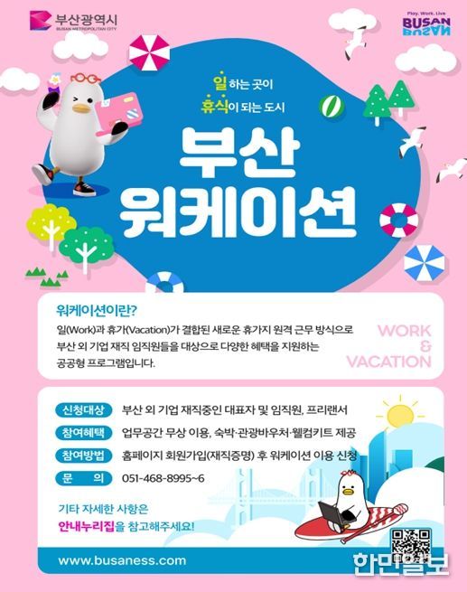 한민일보 서울포커스 임광현 기자 | 부산시는 한국관광공사가 주최하는 '2026년 워케이션 우수모델' 공모사업에 '부산형 워케이션(휴가지 원격근무)'이 전국을 대표하는 워케이션 도시로 최종 선정됐다고 오늘(24일) 밝혔다.