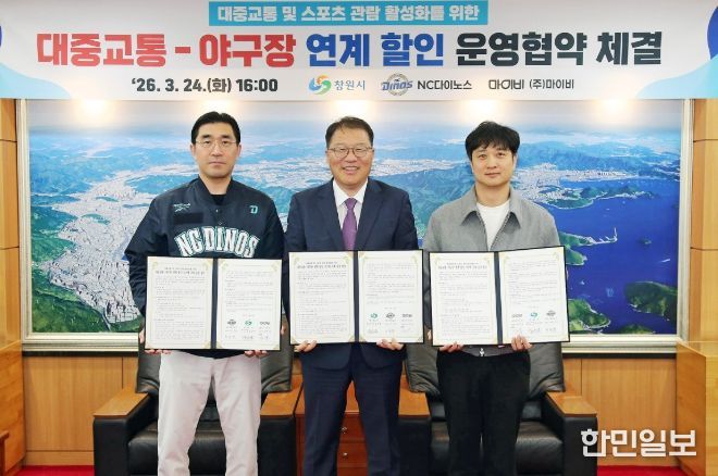 한민일보 서울포커스 김서윤 기자 | 창원특례시와 NC 다이노스, ㈜마이비는 24일 창원시청에서 시내버스-야구장 연계 할인 서비스 제공을 위한 업무협약을 체결했다.