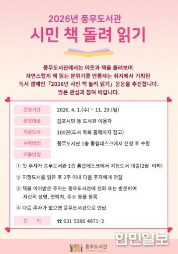 한민일보 서울포커스 임경복 기자 | 김포시 풍무도서관은 오는 4월부터 ‘2026년 시민 책 돌려 읽기’ 독서 릴레이를 운영한다.