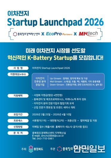 한민일보 서울포커스 임경복 기자 | 충북도가 이차전지 혁신 기술을 보유한 스타트업을 발굴해 육성하는 '이차전지 스타트업 육성 플랫폼 구축 지원사업(이차전지 Startup Launchpad 2026)' 참여 기업을 4월 10일까지 모집한다.