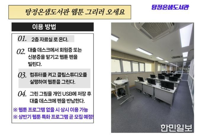 한민일보 서울포커스 임경복 기자 | 아산시는 시민들의 창작 역량을 지원하고 웹툰 특화 도서관으로서의 기능을 강화하기 위해 탕정온샘도서관에 웹툰창작실을 새롭게 조성하고 본격 운영에 들어간다.
