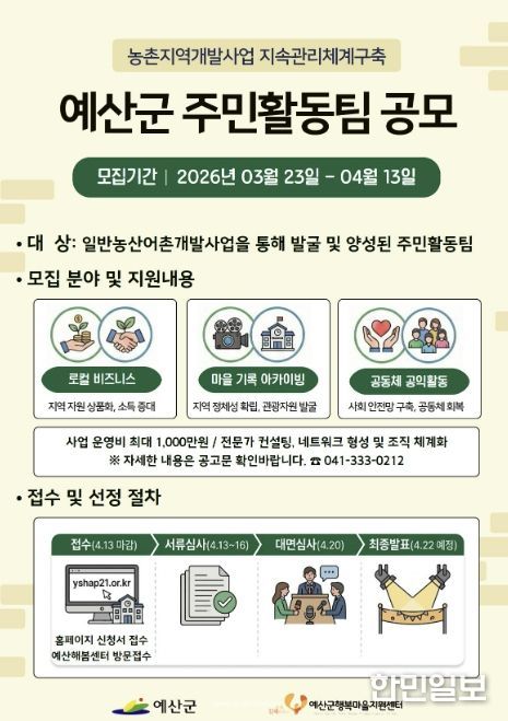 한민일보 서울포커스 임경복 기자 | 예산군행복마을지원센터는 주민의 지역개발사업 참여를 확대하고 주민활동팀의 자립체계 구축을 지원하기 위해 ‘농촌지역개발사업 지속관리체계 구축’ 주민활동팀을 4월 13일까지 모집한다고 밝혔다.