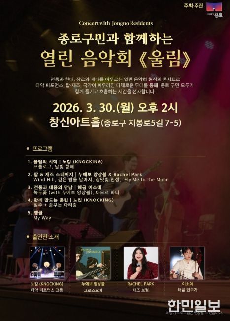 한민일보 서울포커스 김서윤 기자 | 종로구가 봄을 맞아 도심 곳곳을 문화의 온기로 채울 무료 음악 공연을 선보인다.