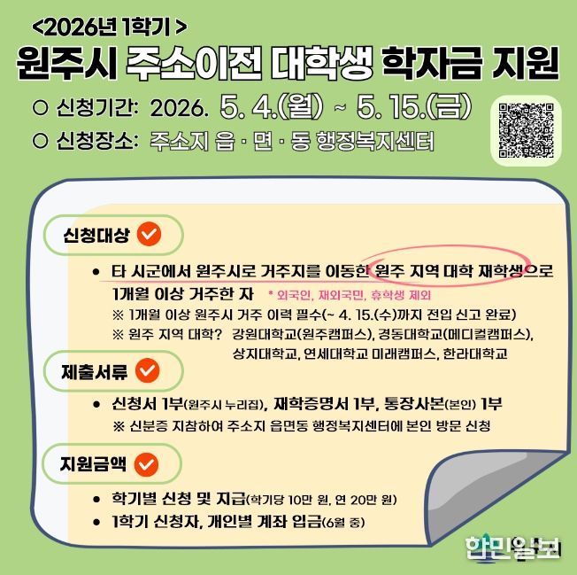 한민일보 서울포커스 임경복 기자 | 원주시는 전입신고를 마치고 원주시민이 된 대학생에게 상·하반기 각 10만 원씩 연간 20만 원의 학자금을 지원한다.