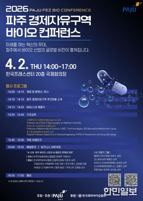 한민일보 서울포커스 진광성 기자 | 파주시는 오는 4월 2일 14시, 서울 중구 한국프레스센터 국제회의장에서 녪파주 경제자유구역 바이오 컨퍼런스’를 개최한다.