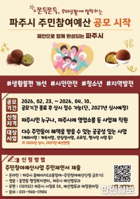 한민일보 서울포커스 진광성 기자 | 파주시는 2027년도 예산 편성에 반영할 주민참여예산 시민 제안을 오는 4월 10일까지 접수한다.