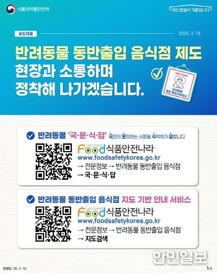 한편, 반려동물 동반 출입 음식점 현황(지도 기반 안내 서비스), 반려동물 국·문·식·답(국민이 문의하는 사항을 식약처가 답한다), 운영 매뉴얼 및 홍보자료, 질의응답 등 관련 자료는 식품안전나라 누리집에서 확인할 수 있다.
