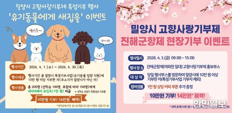 참여 방법은 고향사랑e음 누리집에 접속해 ‘특정사업 기부하기’ 메뉴에서 경상남도 밀양시 ‘유기동물 입양 지원사업’을 선택해 기부하면 자동으로 응모된다. 당첨자는 5월 8일까지 개별 안내될 예정이다.