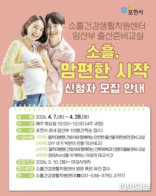 한민일보 서울포커스 심기옥 기자 | 포천시 소흘건강생활지원센터는 임산부의 건강한 임신과 안전한 출산을 지원하기 위해 임산부 출산준비교실 ‘소흘, 맘편한 시작’ 참여자를 모집한다.