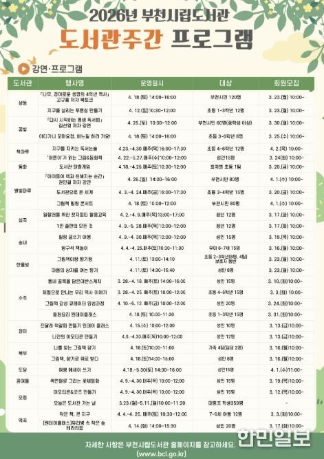 한민일보 서울포커스 김윤이 기자 | 부천시는 4월 ‘도서관의 날’과 제62회 도서관 주간을 맞아 ‘도서관 속 작은 펼침, 세상을 여는 큰 열림’을 슬로건으로 다양한 행사와 프로그램을 운영한다.