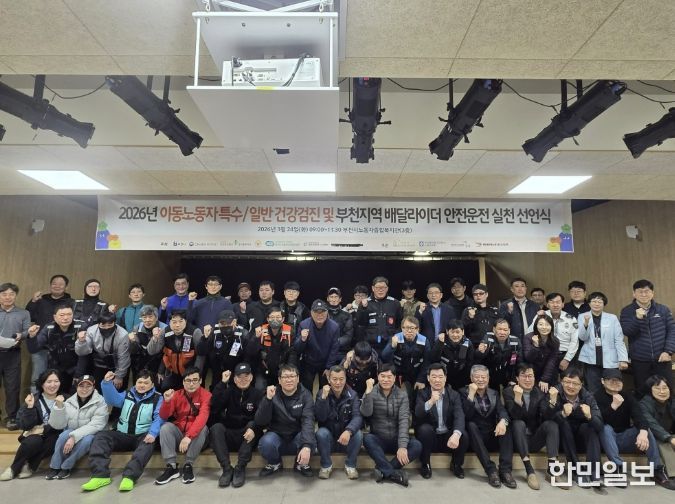 한민일보 서울포커스 김윤이 기자 | 부천시는 지난 24일 부천시노동자종합복지관에서 이륜차 사고 예방과 안전한 배달문화 정착을 위해 ‘2026년 이동노동자 건강검진 및 부천지역 배달 라이더 안전운전 실천 선언식’을 열었다.