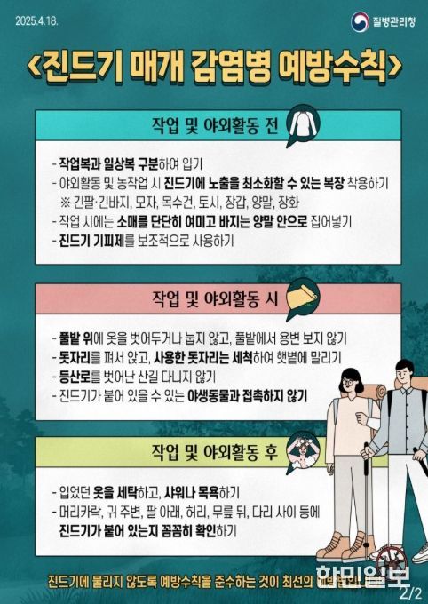 진드기에 물리지 않는 3단계 예방 수칙은 (1단계) 야외 활동 전 작업복 착용 시 소매를 단단히 여미고 바지는 양말 안으로 집어 넣는 등 피부 노출을 최소화한다. (2단계) 야외 활동 후에는 작업복을 털어 즉시 세탁하고, 귀가 후 바로 샤워하며 진드기에 물린 흔적이 있는지 꼼꼼히 관찰한다. (3단계) 야외활동 후 2주 이내 고열, 구토 등의 증상이 나타나면 즉시 의료기관을 방문하여 치료받는다.