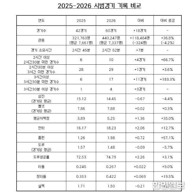 경기 평균 소요 시간은 2시간 52분으로 2025년 대비 7분 늘었으며, 경기당 삼진은 14.45개, 볼넷은 7.88개로 각각 4.4% 감소, 0.3% 증가를 기록했다. 평균자책점은 지난해 3.89에서 5.25로 높아져 35.0%의 증가 폭을 보였다.