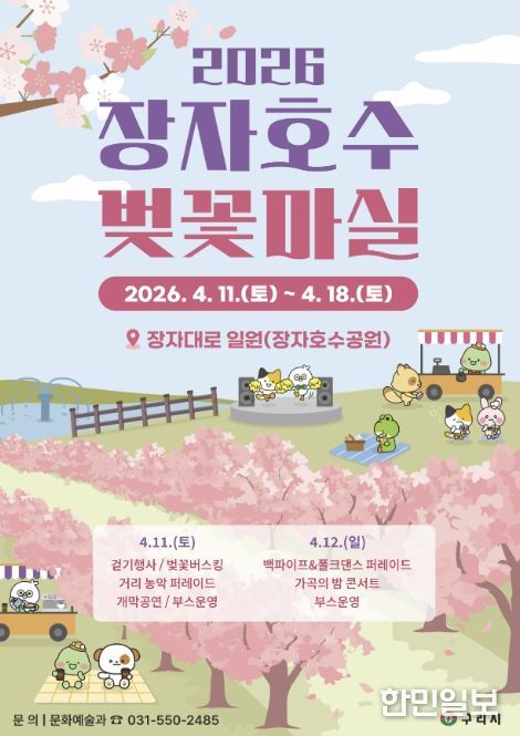한민일보 서울포커스 김정옥 기자 | 구리시는 오는 4월 11일부터 18일까지 8일간 장자대로 일원(장자호수공원)에서 ‘2026 장자호수 벚꽃마실’을 개최한다고 밝혔다.