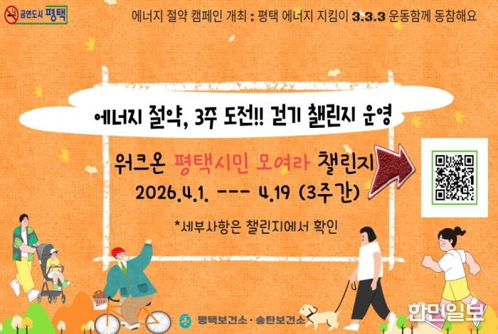 한민일보 서울포커스 황준형 기자 | 평택시는 최근 중동 사태 장기화에 따른 국제 유가 상승 등 에너지 위기 상황을 극복하고, 시민 주도의 실천 문화를 확산하기 위해 오는 4월 1일부터 19일까지 3주간“‘에너지 절약, 걷기 챌린지”를 운영한다고 밝혔다.