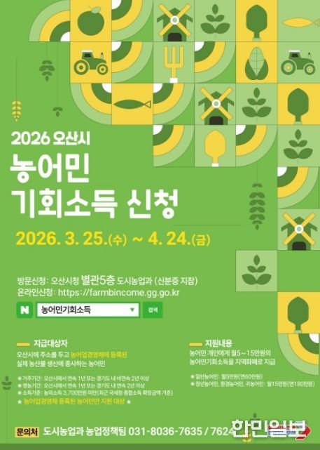 한민일보 서울포커스 임경복 기자 | 오산시는 농업·농촌의 공익적 가치 보장과 농어촌 소멸위기 대응을 위해 ‘2026년 농어민 기회소득’ 신청·접수를 3월 25일부터 4월 24일까지 진행한다고 밝혔다.