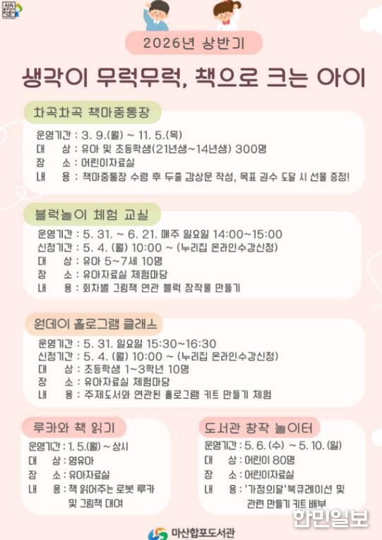 한민일보 서울포커스 김서윤 기자 | 창원특례시 마산합포도서관은 어린이를 대상으로 체험과 놀이를 기반으로 한 독서프로그램 ‘생각이 무럭무럭, 책으로 크는 아이’를 3월부터 11월까지 운영한다.