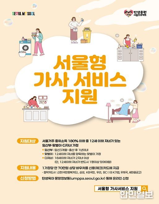 ‘서울형 가사서비스’는 임산부 가정은 안전한 출산에 집중하고, 맞벌이‧다자녀 가정은 아이와 더 많은 시간을 보낼 수 있도록 가사관리사가 가정을 방문해서 청소, 설거지, 빨래 같은 집안일을 도와주는 사업이다. 중위소득 180% 이하 임산부‧맞벌이‧다자녀가정이 가사서비스를 이용할 수 있도록 시가 연 70만 원 상당의 바우처를 지원한다.