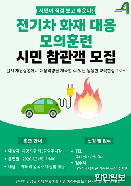 한민일보 서울포커스 임경복 기자 | 안성시시설관리공단은 오는 4월 2일 목요일 오후2시 안성시 옥산동 소재 아양지구 제3공영주차장에서 ‘시민과 함께하는 2026년 재난대응 모의훈련’을 실시한다고 밝혔다.