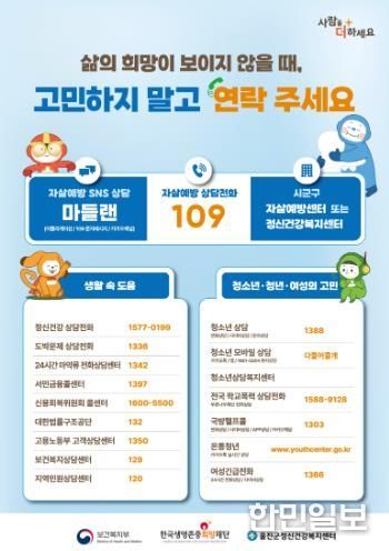 한편 우울감 등으로 전문가의 도움이 필요한 경우 자살예방상담전화 109 또는 정신건강위기 상담전화를 통해 24시간 상담을 받을 수 있다.