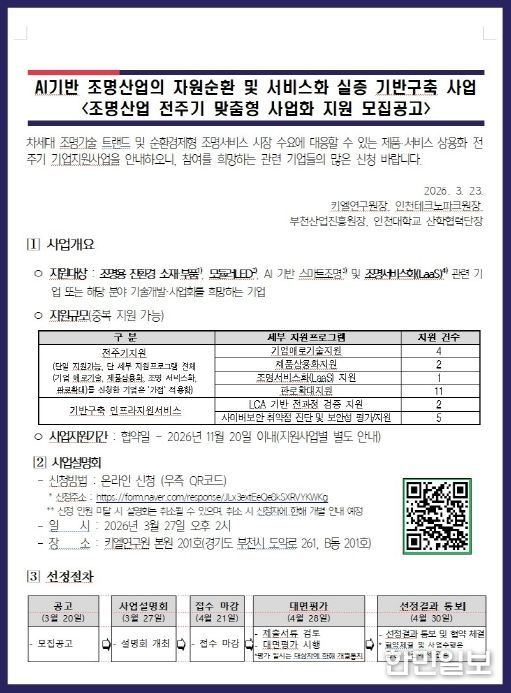 한민일보 서울포커스 유창렬 기자 | 인천테크노파크(인천TP)는 산업통상부의 ‘AI 기반 조명산업의 자원순환 및 서비스화 실증 기반구축사업’의 일환으로, 조명기업 대상 전주기 사업화 지원 프로그램에 참여할 기업을 오는 4월 21일까지 모집한다고 밝혔다.