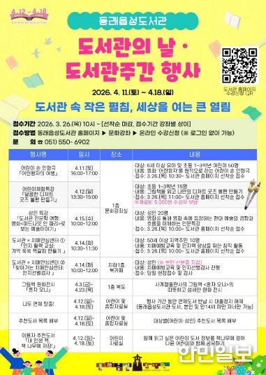 동래구 관계자는 “이번 행사를 통해 일상 속에서 지식의 즐거움을 발견하고, 도서관을 통해 다양한 주민들이 책으로 소통하는 따뜻한 봄날의 축제가 되기를 바란다”라고 말했다.