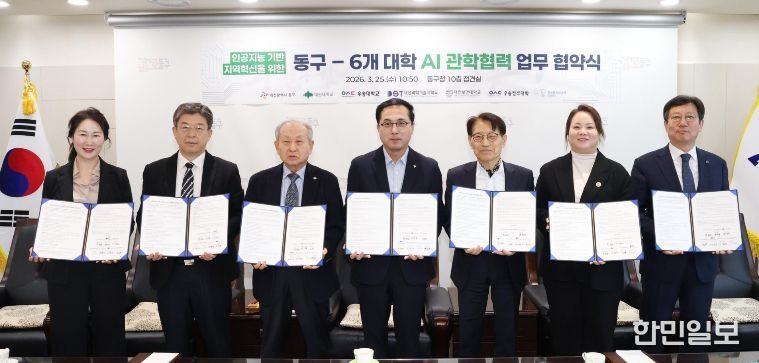한민일보 서울포커스 임경복 기자 | 대전 동구는 25일 대전대학교, 우송대학교, 대전과학기술대학교, 대전보건대학교, 우송정보대학, 한국폴리텍Ⅳ대학 대전캠퍼스와 ‘인공지능(AI) 기반 지역혁신을 위한 관학협력 업무협약’을 체결했다고 밝혔다.