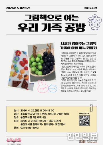 한민일보 서울포커스 임경복 기자 | 김포시 통진도서관은 제62회 도서관주간을 맞아 오는 4월 25일 오전 11시, ‘그림책으로 여는 우리 가족 공방’을 운영한다.