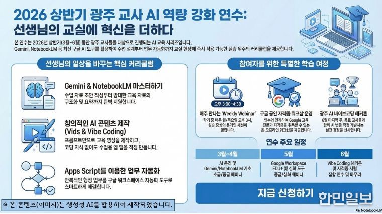 한민일보 서울포커스 임경복 기자 | 광주시교육청은 오는 26일부터 초·중·고·특수학교 교원 280여 명을 대상으로 ‘2026 상반기 생성형 AI 역량 강화 연수’를 운영한다.