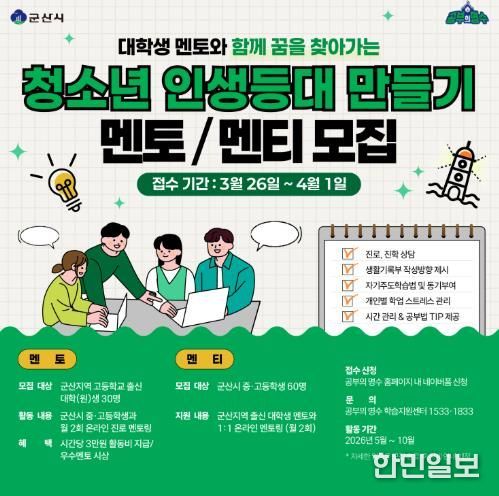 한민일보 서울포커스 김용택 기자 | 군산시는 관내 중·고등학생의 진로 탐색과 학습 역량 강화를 지원하기 위해 지역 출신 대학생이 참여하는 ‘청소년 인생등대 만들기’ 사업을 추진하고, 멘토와 멘티를 모집한다고 밝혔다.