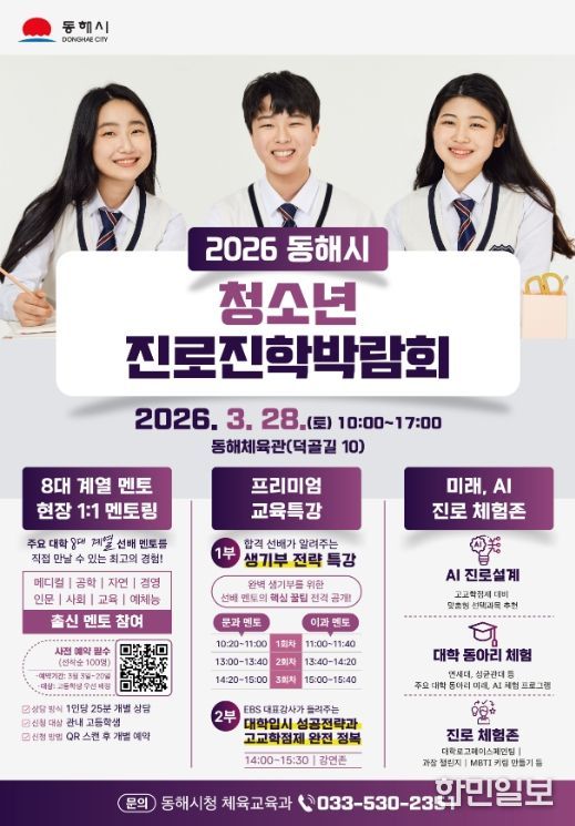 한민일보 서울포커스 임경복 기자 | 동해시는 오는 3월 28일 오전 10시부터 오후 5시까지 동해체육관에서 ‘2026 동해시 청소년 진로·진학 박람회’를 연다.