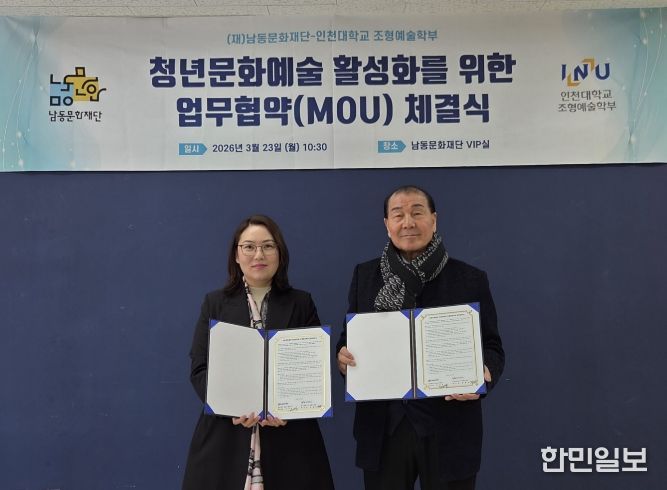 한민일보 서울포커스 김성혜 기자 | 인천 남동문화재단은 청년 문화예술 활성화와 남동구의 문화예술 발전을 위해 인천대학교 조형예술학부(학부장 장경애)와 ‘업무협약(MOU)’을 맺었다고 26일 밝혔다.