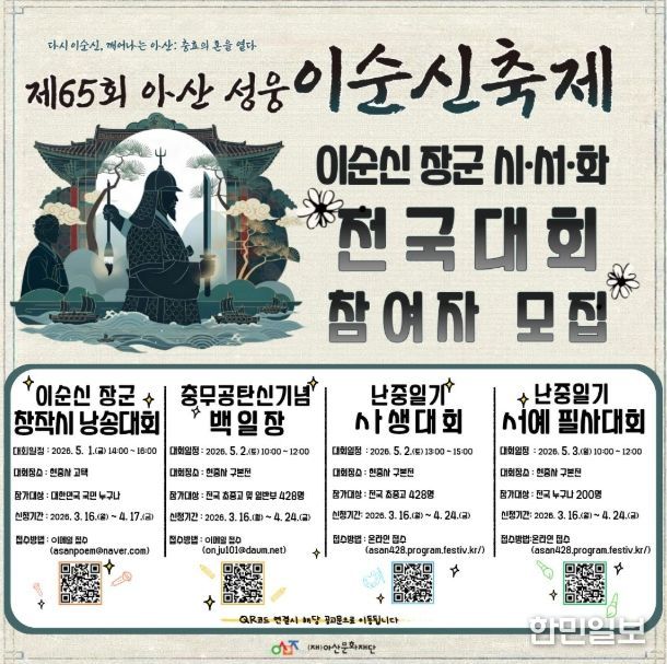 한민일보 서울포커스 임경복 기자 | (재)아산문화재단은 '제65회 아산 성웅 이순신 축제'를 맞아 성웅 이순신 장군의 충효애 정신과 숭고한 뜻을 기리고 계승하기 위한 ‘이순신 장군 시·서·화 전국대회’를 개최하고 전국의 참가자를 모집한다.