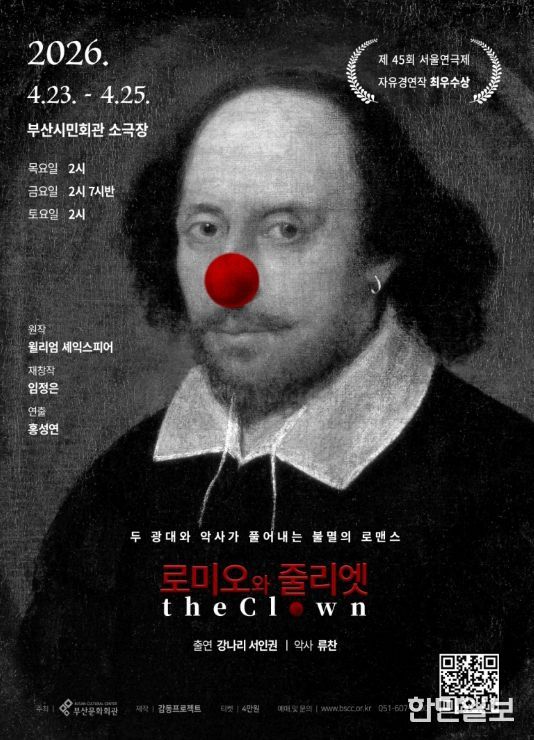 한민일보 서울포커스 임광현 기자 | (재)부산문화회관(대표이사 차재근)은 오는 4월 23일부터 25일까지 3일간 부산시민회관 소극장에서 연극 '로미오와 줄리엣 The Clown〉을 선보인다. 이 작품은 2024년 제45회 서울연극제 자유경연작 최우수상 수상작으로 예술성과 완성도를 동시에 인정 받으며 관객과 평단의 호평을 받은 작품이다.