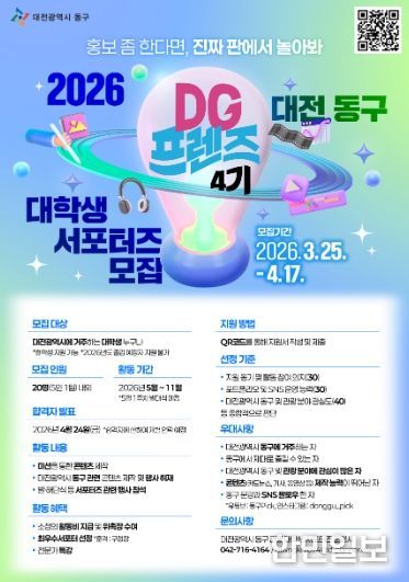 한민일보 서울포커스 임경복 기자 | 대전 동구는 오는 4월 17일까지 동구의 매력을 창의적인 콘텐츠로 알릴 대학생 관광서포터즈 ‘DG프렌즈 4기’를 공개 모집한다고 26일 밝혔다.
