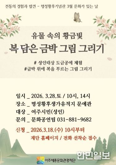 한민일보 서울포커스 전희주 기자 | 여주세종문화관광재단은 오는 3월 28일, 명성황후기념관 3월 문화가 있는 날 프로그램으로 '유물 속의 황금빛, 복 담은 금박 그림 그리기'를 진행한다.