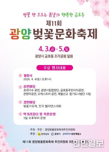 한민일보 서울포커스 임광현 기자 | 광양시 금호동은 오는 4월 3일부터 4월 5일까지 금호동 조각공원 일원에서 3일간 제11회 광양벚꽃문화축제를 개최한다고 밝혔다.