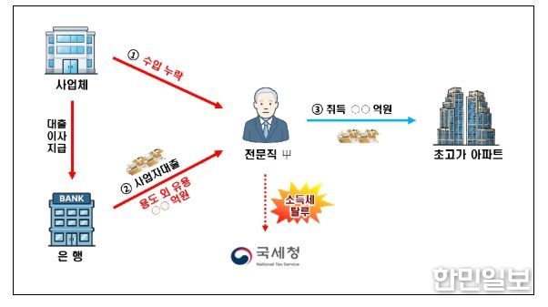 실제 고소득 전문직 사업자가 강남권 고가 아파트를 ○○여억 원에 취득하면서 ○○억 원의 사업자 대출금과 ○○억 원의 신고누락된 탈루자금을 사용한 것으로 드러났으며, 수년간 ○억 원에 달하는 사업자 대출 관련 이자를 경비 계상하여 탈세한 사실도 확인됐다.
