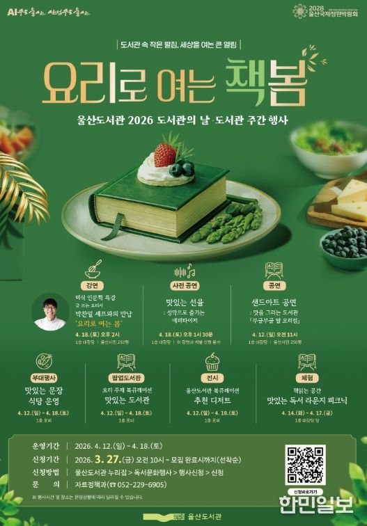 울산도서관 관계자는 “도서관의 날과 도서관 주간을 기념해 시민들이 도서관을 통해 새로운 문화를 즐기면서 건강한 맛도 챙기는 다양한 프로그램을 준비했다”라며, “울산도서관에서는 요리를 주제로 한 인문학적 즐거움을, 울산어린이청소년도서관에서는 반려동물을 통해 생명 존중과 공감의 가치를 배우며 스스로 성장하는 계기가 되길 바란다”라고 말했다.