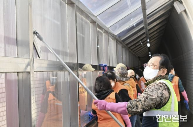 특히 이날 현장에는 이현재 하남시장이 직접 작업복 차림으로 나타나 주민들 곁에서 팔을 걷어붙였다. 이 시장은 한솔리치빌 방향 보행로 칸막이 부스에 집결한 주민들과 함께 창 청소용 걸레를 나눠 들고, 터널 내부 보도부 창에 겹겹이 쌓인 미세먼지와 매연 자국을 직접 닦아내며 구슬땀을 흘렸다.