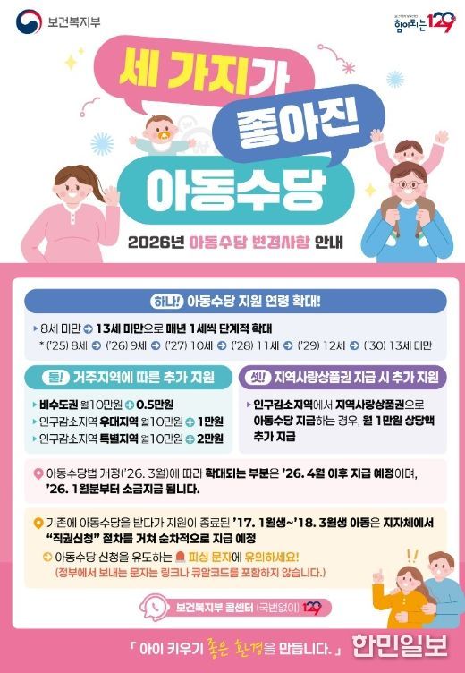 아동수당 지급 연령 확대에 따라, 2017년 1월생부터 2018년 3월생 아동에 대해 문자메시지와 우편물 발송을 통해 관련 내용을 안내하고, 보호자의 동의를 받아 2026년 미지급분을 소급 지급할 계획이며, 보호자 동의 방법은 거주지 읍면동 행정복지센터에 연락하면 된다.