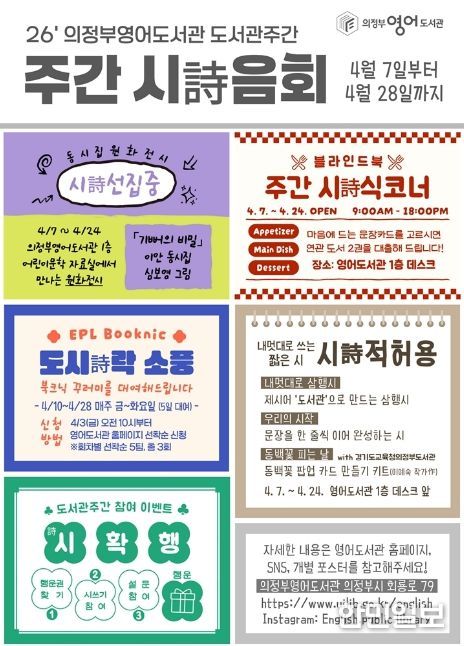 한민일보 서울포커스 심기옥 기자 | 의정부영어도서관은 ‘2026 도서관주간’을 맞아 4월 7일부터 28일까지 의정부시 도서관 이용 시민을 대상으로 독서문화 행사를 진행한다.