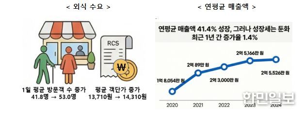 2024년 실적 기준 외식업체 당 연평균 매출액은 2억 5,526만 원으로, 2021년(1억 8,054만 원) 대비 무려 41.4%나 성장했다.