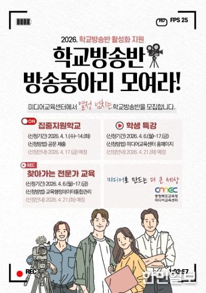 한민일보 서울포커스 임경복 기자 | 충청북도교육청 직속기관 교육연구정보원(원장 이찬동) 미디어교육센터는 학교 방송활동 활성화와 학생 미디어 제작 역량 강화를 위해 '2026 학교방송반 활성화 지원' 프로그램을 운영한다.