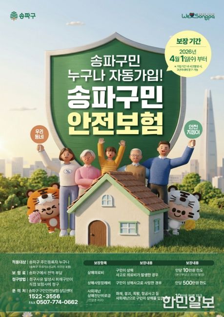 한민일보 서울포커스 박정민 기자 | 서울 송파구가 일상생활 중 발생하는 각종 상해사고에 대비해 ‘송파구민 안전보험’을 오는 4월 1일부터 처음으로 시행한다.