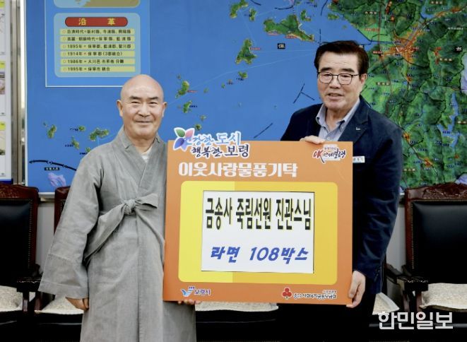 한민일보 서울포커스 임경복 기자 | 보령시는 27일 시장실에서 김동일 보령시장과 삽시도 금송사 죽림선원 진관스님 등 관계자가 참석한 가운데 이웃사랑 후원물품 전달식을 가졌다고 밝혔다.