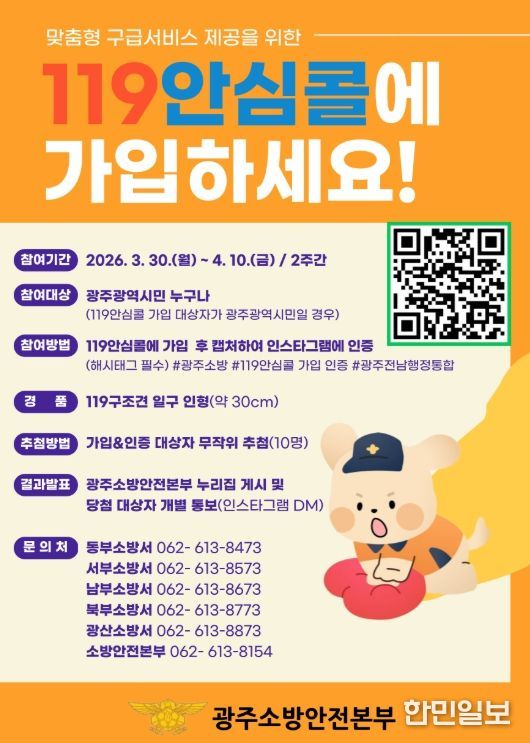 참여방법은 119안심콜에 가입한 뒤 가입완료 화면을 개인 인스타그램에 게시하면 된다. 게시물에는 #광주소방, #119안심콜가입인증, #광주전남행정통합 등 해시태그를 포함해야 한다.